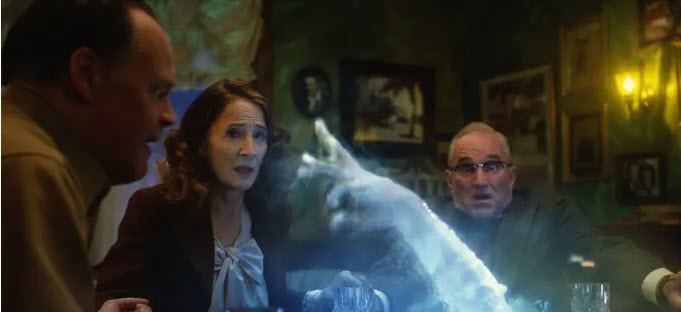 Recently widowed Clive (Larry Fessenden, Jakob’s Wife) has requested the presence of his war buddies, and they’ve obliged, unaware of the trouble they’re walking into. Marla (Anne Ramsay, The Taking of Deborah Logan), Archie (Jeremy Holm, Don’t Look Back), and Paul (Ezra Buzzington, The Nowhere Inn) are Clive’s closest confidants. Though Marla’s vanilla husband Bob (Ron E. Rains) has joined them, the quartet has business to conduct. Clive is hoping to hold a slapdash séance to contact his wife, and when it goes awry, it opens a dangerous door that everyone in attendance will need to shut before they can leave.