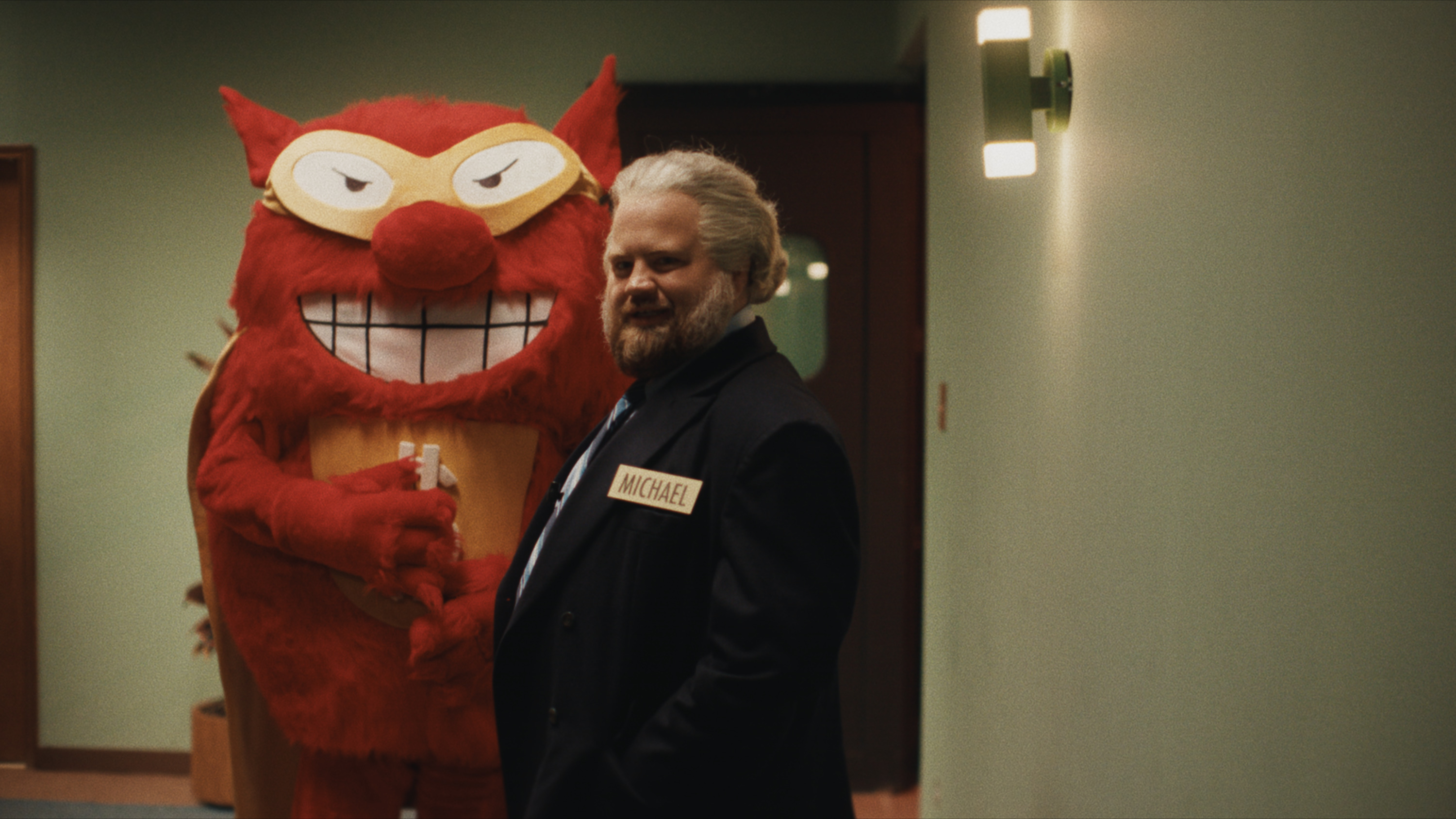 Hauser plays Larson with the sort of twitchy intensity that’s become his calling card, but there’s something different here. This isn’t his schlubby, wounded Richard Jewell performance or his out-there scene-stealing turn in Cruella. As Larson, he’s controlled chaos. A man constantly underestimated, hiding a laser-focused mind behind a bushy beard and thrift-store blazer. He doesn’t want fame, he wants validation. Or maybe it’s vindication. Either way, he’s going to get it, even if he has to fake his way into a Press Your Luck audition to do so.