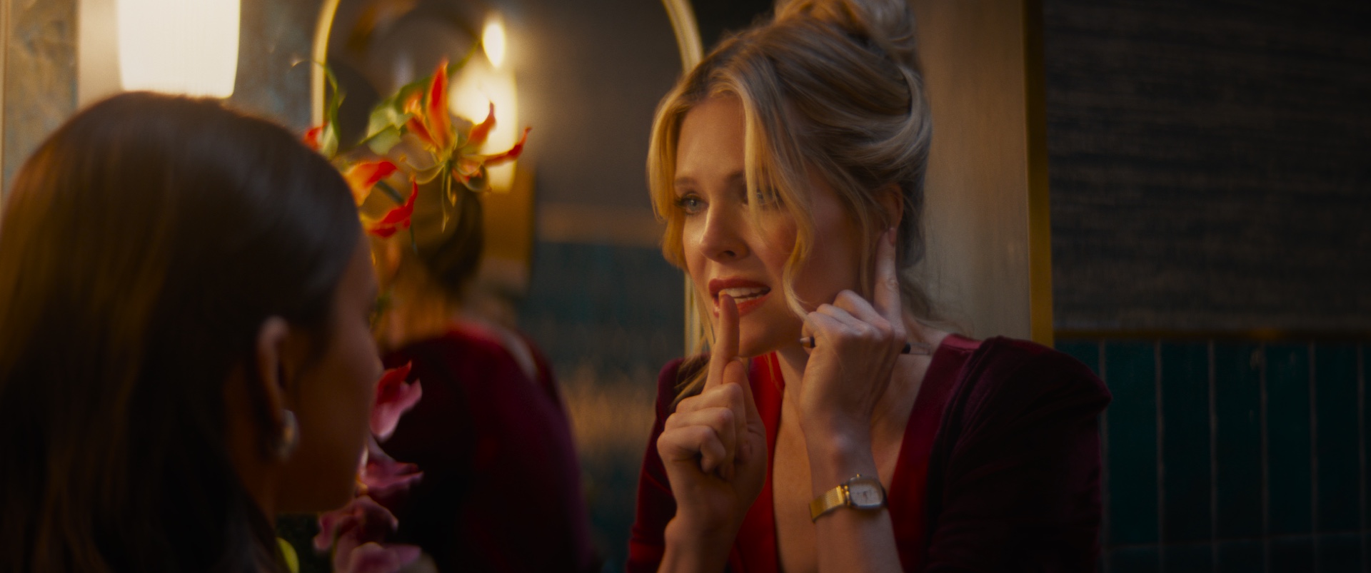 Fahy is fantastic here. Her role demands a slow, controlled unraveling, and she handles it like a pro. As Violet tries to keep up polite conversation while silently spiraling, you can see the micro-adjustments in her face, posture, and breathing. It’s the kind of tension that only works when the actor is completely dialed in—and she is.