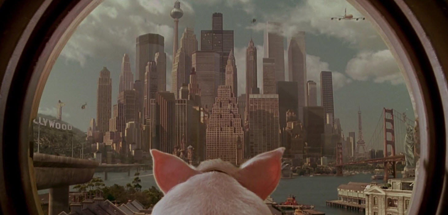 Miller, who produced and co-wrote the original but handed directing duties to Chris Noonan, took the reins himself for the sequel and made something far stranger and more ambitious than anyone expected. Pig in the City plays like a Grimm fairy tale filtered through a hallucinatory daydream. The city itself is an impossible collage of world landmarks — the Sydney Opera House, the Hollywood sign, the Eiffel Tower, and the Statue of Liberty all visible from the same vantage point — creating a setting that feels both everywhere and nowhere. The tonal swings are extreme. One scene plays as broad physical comedy; the next deals with genuine peril and loss. It’s the kind of movie that trusts children with more complexity than most adult dramas bother to offer.